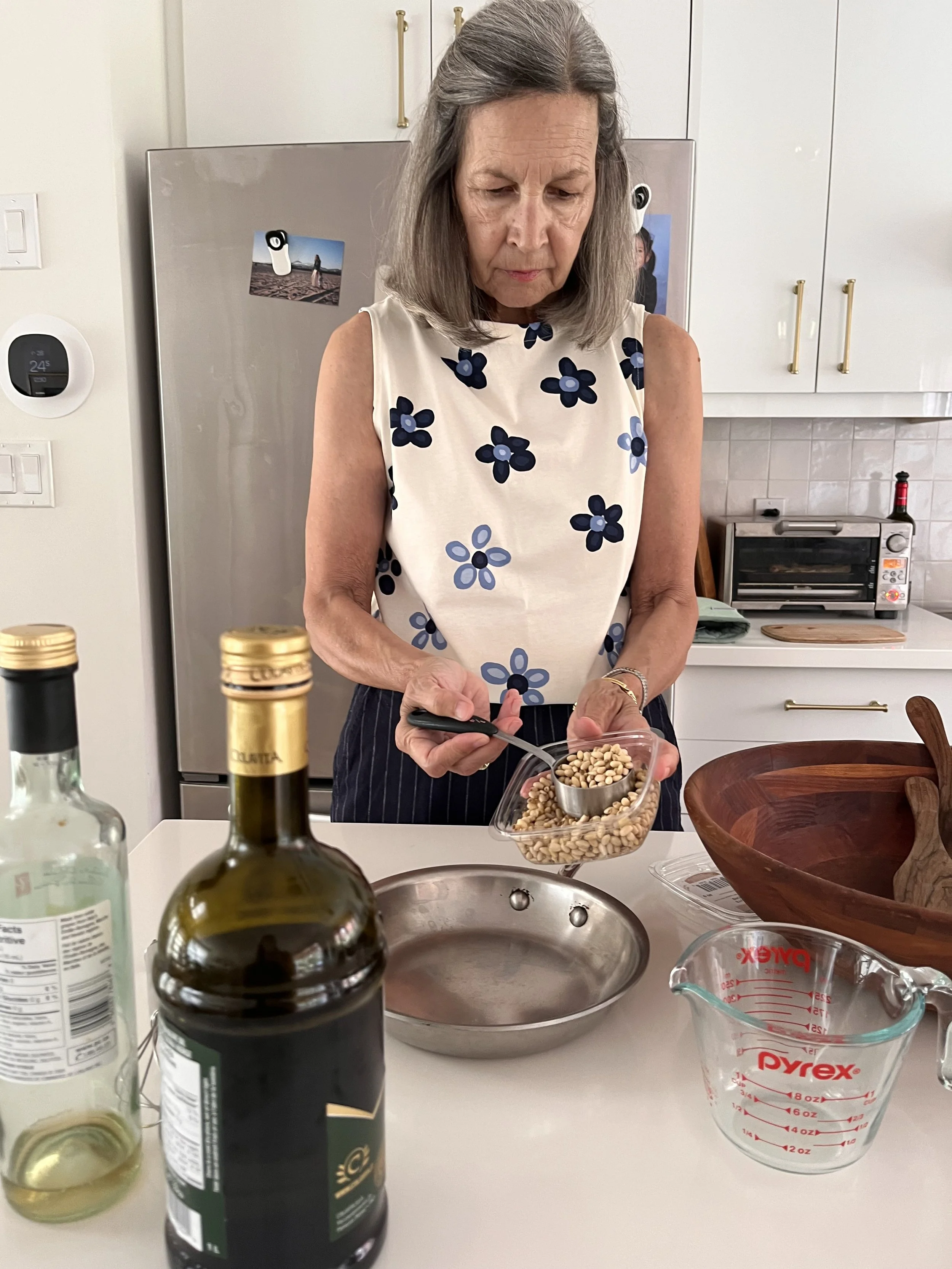 In a small sauté pan, toast the pine nuts over medium heat, tossing often, until golden brown, about 3 minutes. Remove from the heat.