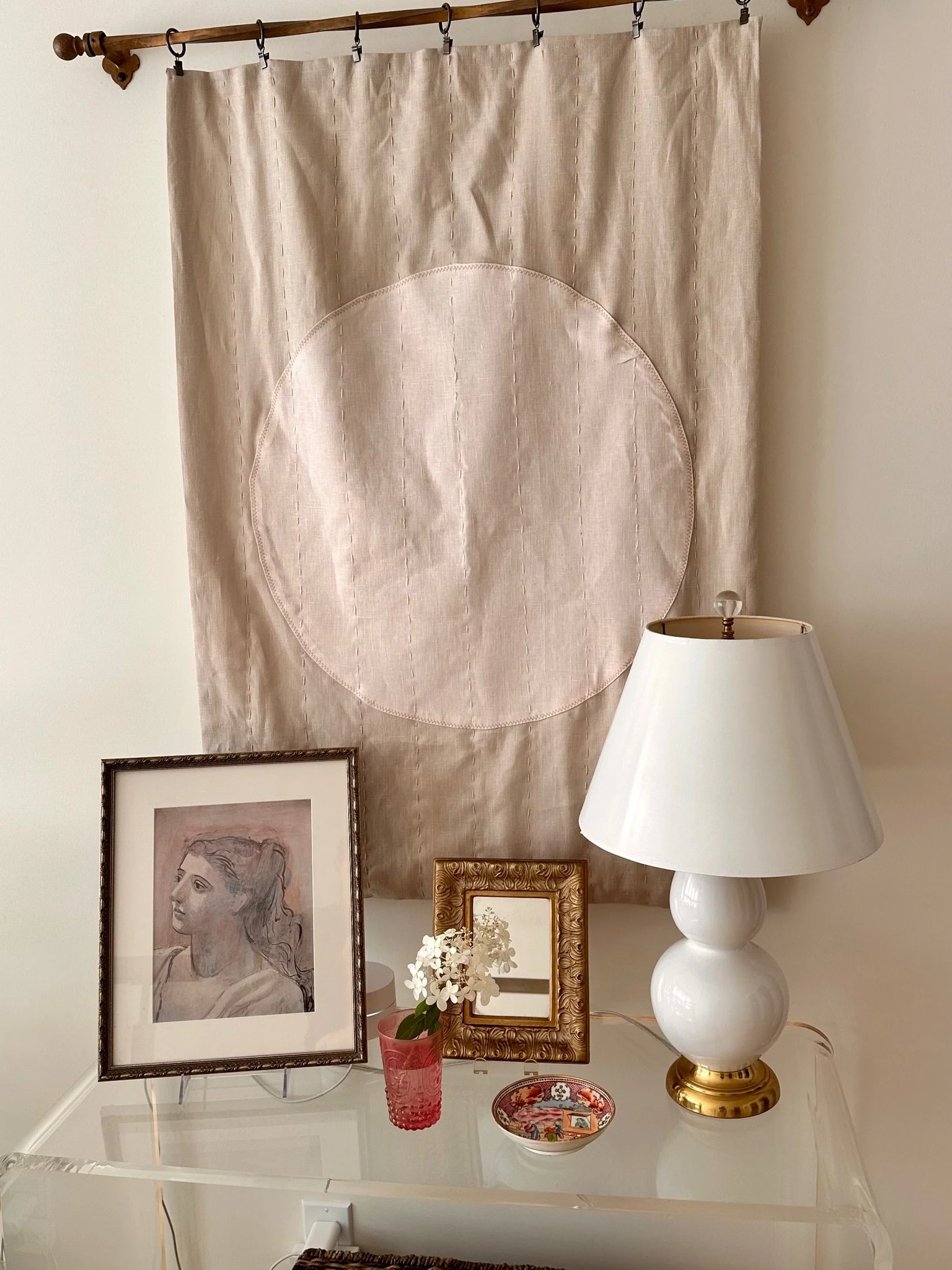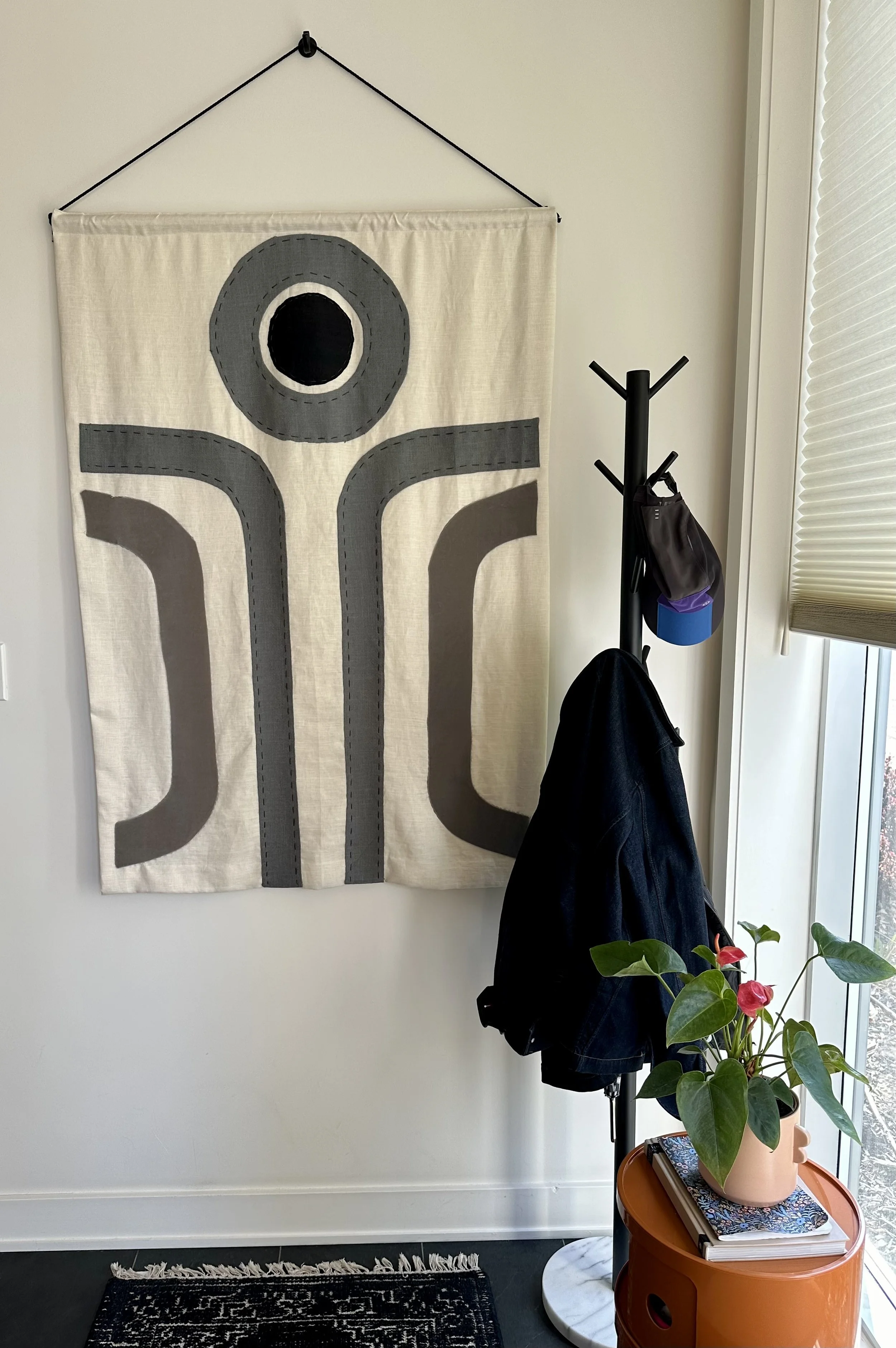 For the first design in the front entryway, I drew on my love of textiles and rudimentary sewing skills. Once I had the large piece of linen (in place of artist’s canvas) for the background, it was a simple matter of cutting out shapes in velvet and hand sewing them to the panel. I then added a backing for structure and hung the piece from a dowel rod purchased at a hardware store.