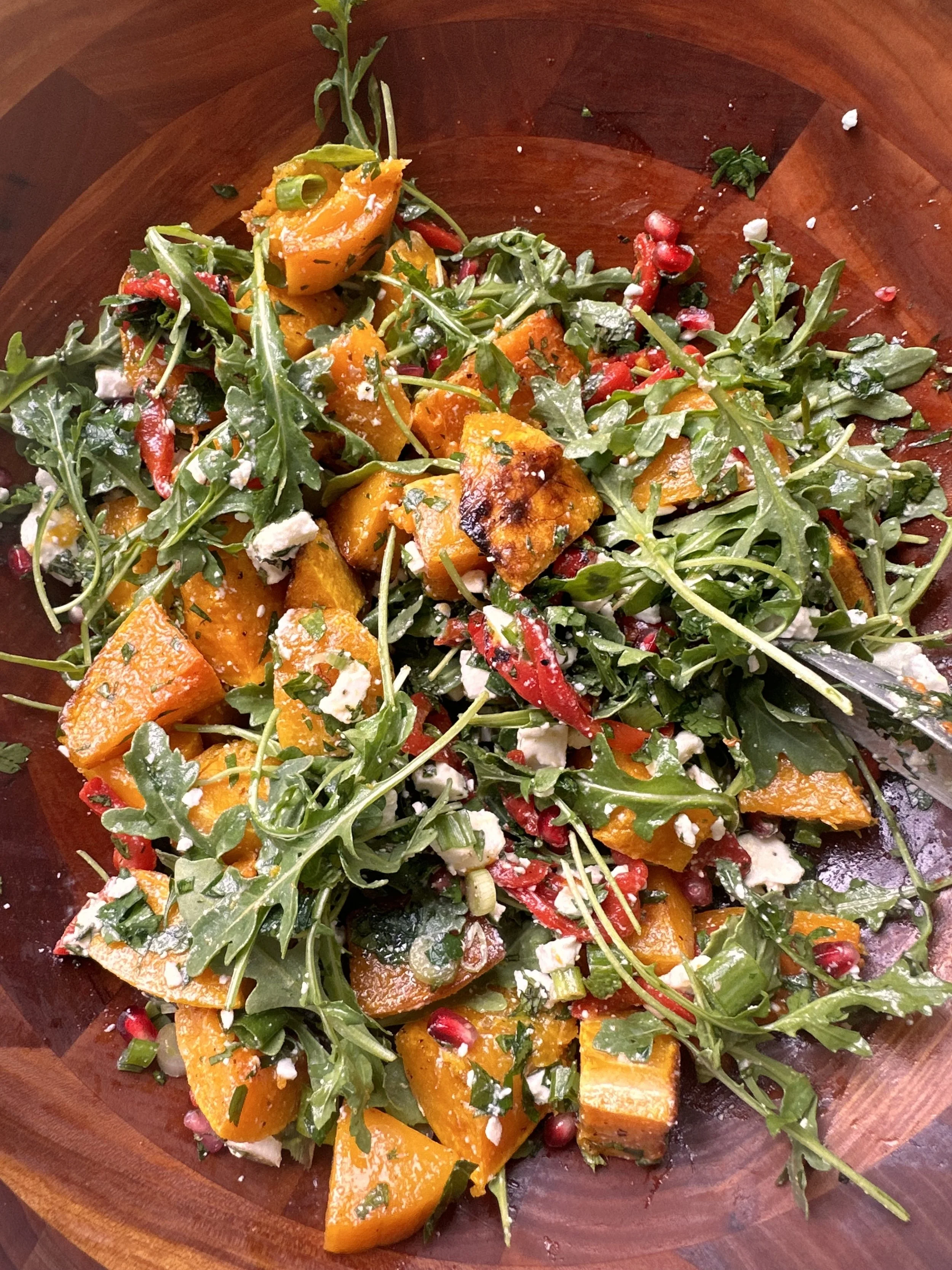 A colourful fall salad featuring roasted sweet potato, feta, arugula and pomegranate seeds